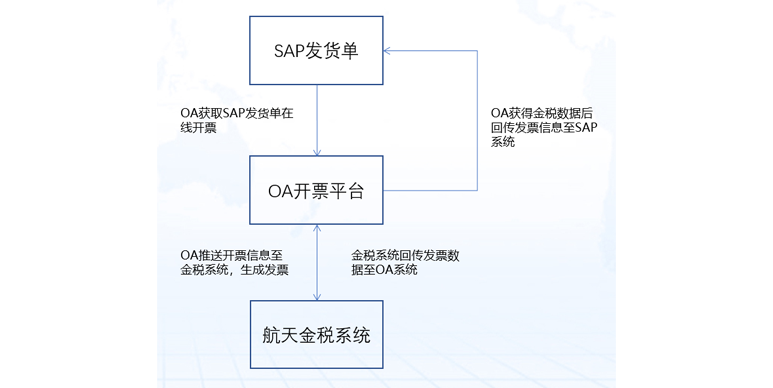 OA與SAP產(chǎn)品對接業(yè)務(wù)流程,具備業(yè)務(wù)可復(fù)制性。金稅系統(tǒng)在線開票業(yè)務(wù)及系統(tǒng)過賬。