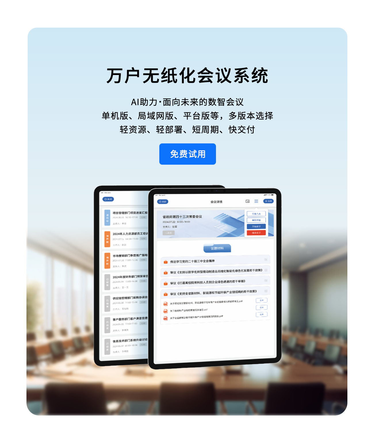 利用AI與大數(shù)據(jù)技術(shù),如語音識別、文字識別、材料識別、文件智能轉(zhuǎn)版等應(yīng)用服務(wù),讓會議更加數(shù)字化、智能化;通過與督辦、公文、重點(diǎn)工作任務(wù)、檔案等系統(tǒng)協(xié)同對接,讓會議決議落地更高效
