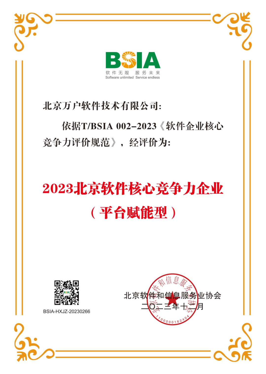 近日,北京軟件和信息服務(wù)業(yè)協(xié)會(huì)第十一屆會(huì)員代表大會(huì)第一次會(huì)議暨第十一屆理事會(huì)在北京召開(kāi),北京市經(jīng)濟(jì)和信息化局,北京市科委、中關(guān)村管委會(huì),中關(guān)村科學(xué)城等相關(guān)負(fù)責(zé)人及300多位會(huì)員企業(yè)代表共同參加本次會(huì)議。會(huì)上發(fā)布了《2023北京軟件企業(yè)核心競(jìng)爭(zhēng)力評(píng)價(jià)報(bào)告》,萬(wàn)戶軟件獲得“2023北京軟件核心競(jìng)爭(zhēng)力企業(yè)(平臺(tái)賦能型)”稱號(hào)。