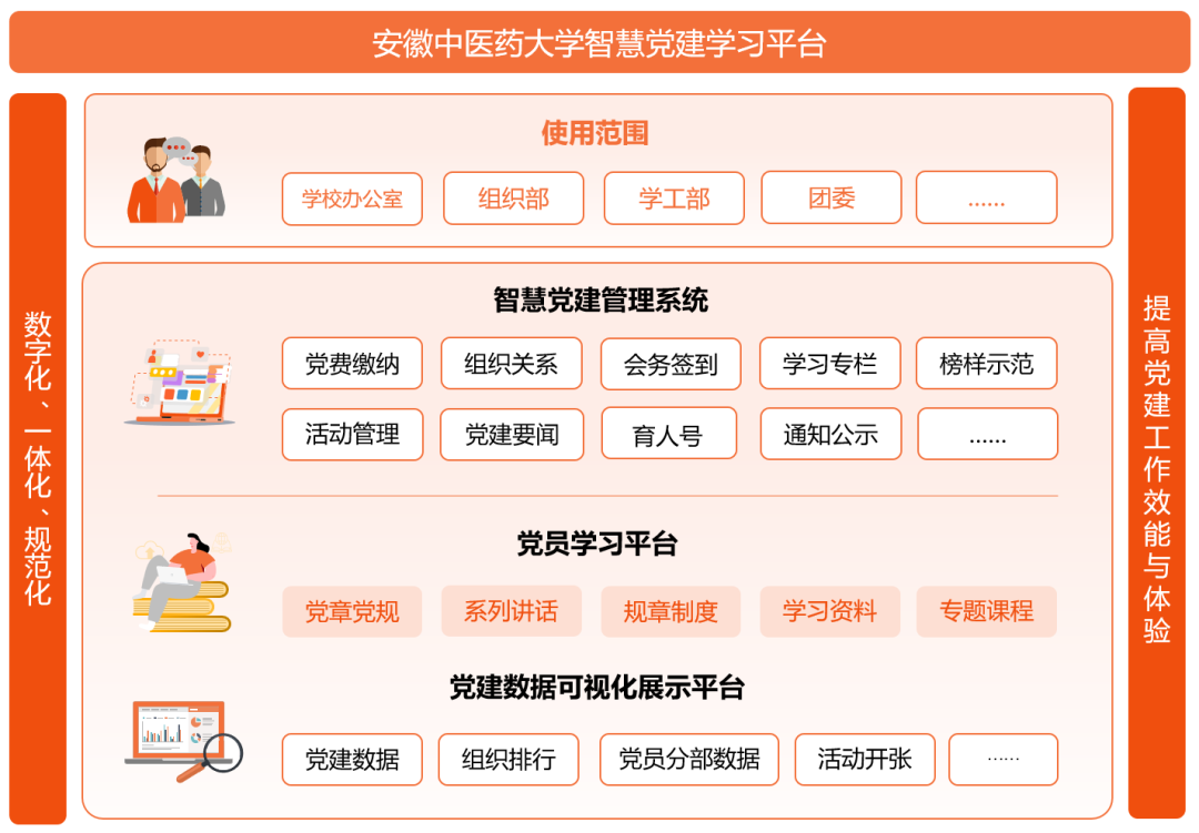通過創(chuàng)建智慧黨建管理系統(tǒng),為校內(nèi)黨委、校二級(jí)黨組織、黨支部工作提供網(wǎng)格化、數(shù)字化的黨建辦公服務(wù)。