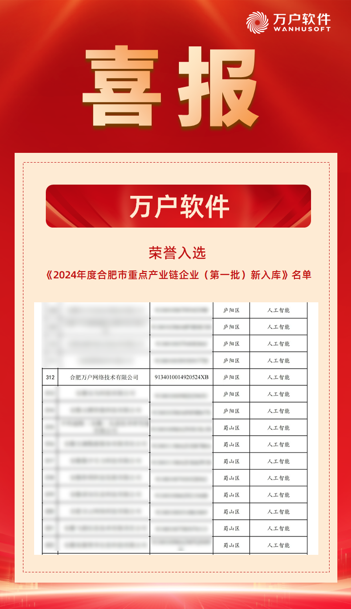 近日,合肥市推進(jìn)戰(zhàn)略性新興產(chǎn)業(yè)發(fā)展工作委員會辦公室發(fā)布《2024年度重點產(chǎn)業(yè)鏈企業(yè)(第一批)新入庫名單》,萬戶軟件憑借在人工智能領(lǐng)域的突出成果,成功入選該名單。