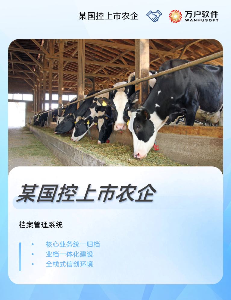 經(jīng)過嚴(yán)格的選型,某國(guó)控上市農(nóng)企選擇萬(wàn)戶檔案管理系統(tǒng)V3,依托系統(tǒng)的全棧信創(chuàng)數(shù)字化檔案管理能力,實(shí)現(xiàn)檔案的一站式全門類管理和一體化集成,檔案管理降成本、固安全,滿足農(nóng)業(yè)企業(yè)的檔案管理數(shù)字化升級(jí)需求,助力打造新質(zhì)生產(chǎn)力。